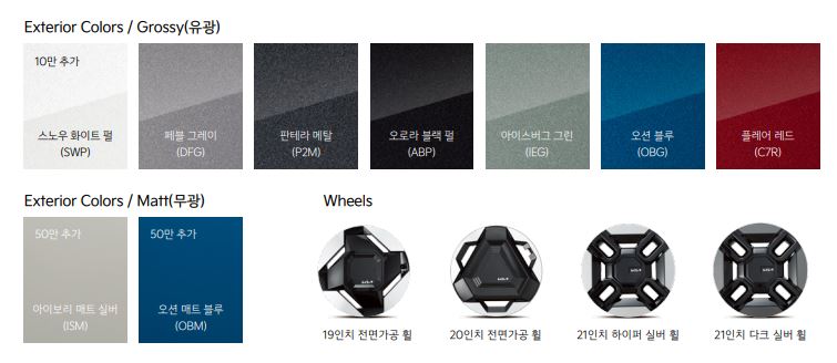 - 유광 : 스노우 화이트펄,페블그레이,판테라메탈,오로라 블랙펄,아이스버그 그린,오션블루,플레어레드