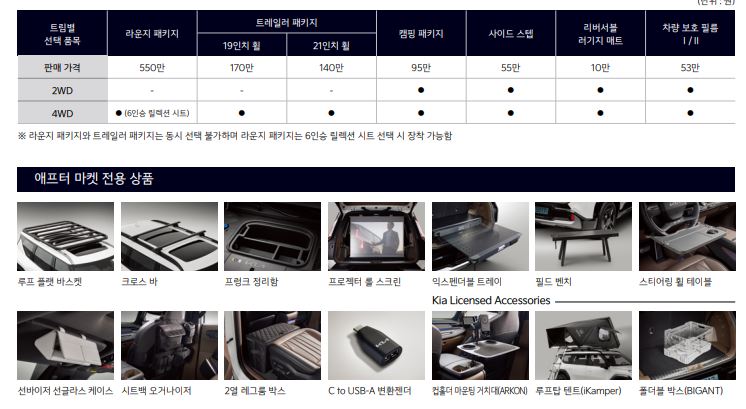 - 신차 구매시 옵션으로 라운지패키지를 550만원 추가할경우 프로젝트 롤스크린이라고 해서 차박할때 밤에 영화도 볼수 있고 너무 멋진 스크린이 설치되어 있구요 필드벤치나 루프탑텐트,휠테이블까지 여행다니기에도 너무 멋져서 개인적으로 마음에 듬