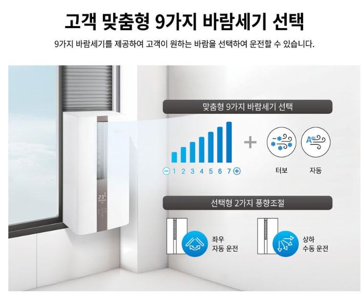 이 제품의 경우 바람의 세기를 9가지로 선택이 가능합니다.디자인도 나름 수려하구요 가격대는 파세코와 비슷한 42만원선의 제품입니다 7평정도의 공간 22제곱미터의 공간은 커버가 완벽하게 된다고 하네요 연장보증보험료는 7천원으로 4년간 무상서비스가 가능합니다.