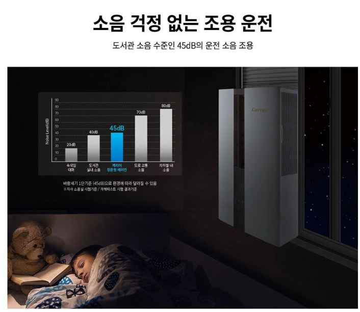 많은 분들이 캐리어 창문형 에어컨도 많이 찾으시는데요 소음은 45데시벨정도 데니까 삼성제품보다는 조금더 소음이 있다고 보시면 되세요 캐리어 상품의 경우 가장 장점중에 하나는 바로 열교환기의 살균기능으로 폐렴균이나 대장균,녹농균,황색포도상구균을 99,9% 억제한다는 장점이 있습니다.