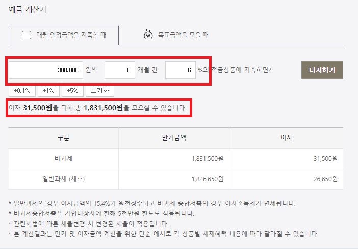 만약 월 30만원을 적금 들었다고 가정할때 만기에 받을수 있는 금액을 예로 들어 드립니다. 이 상품은 6%로 6개월 30만원씩 적금 들었을때를 가정해서 나오는 금액입니다.