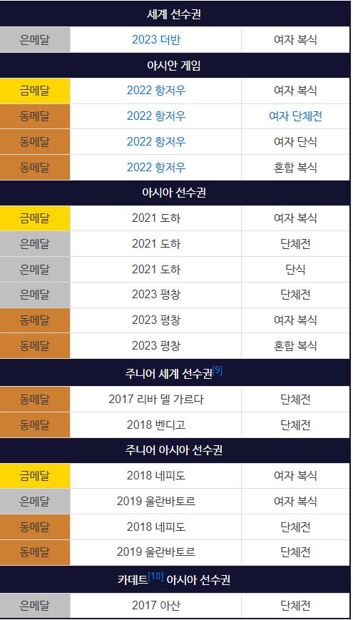 2023년 9월 기준으로 세계8위 한국선수기준으로는 1위이며 여자 복식으로는 전지희 선수에 세운 세계1위 기록을 보유하고 있습니다.